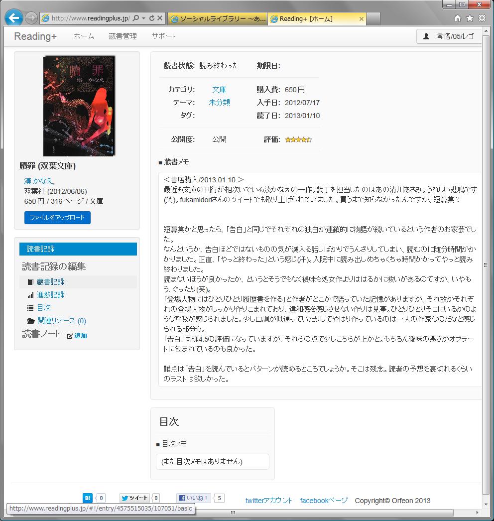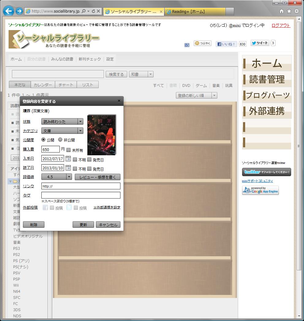左ソーシャルライブラリー(「レビュー・感想を書く」というボタンがある)